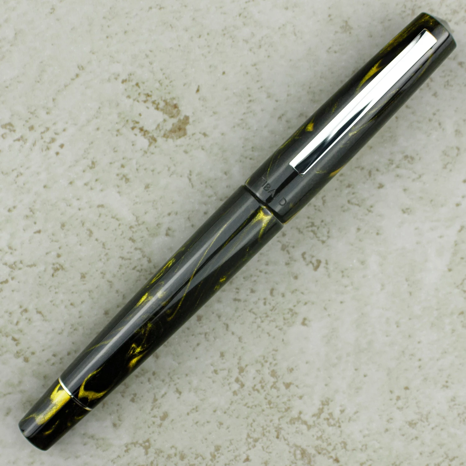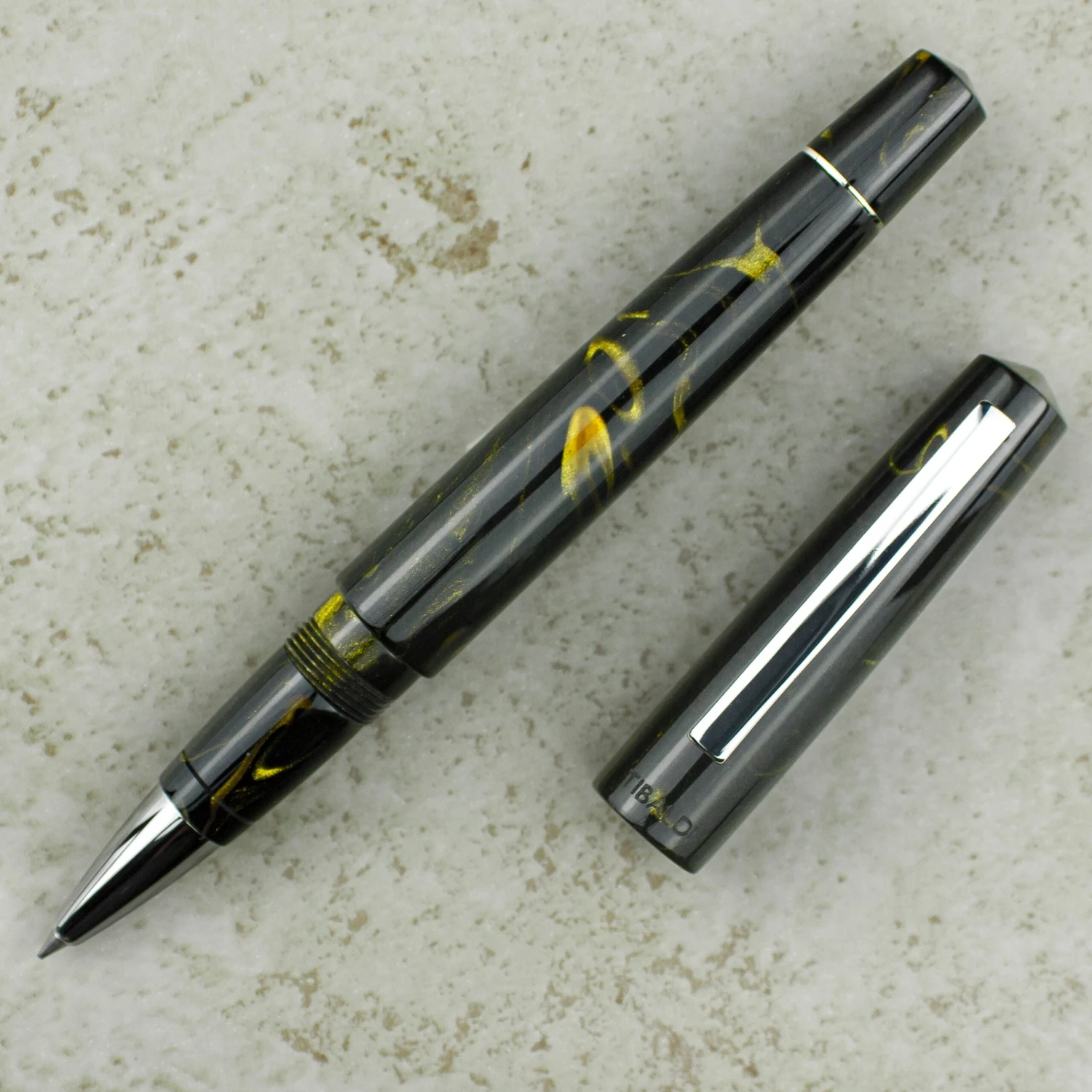 The new Tibaldi Infrangible Black Gold design uses a resin dusted with gold dust, which makes each piece unique and different as the gold flecks glide across the resin creating different shapes. The clip and trim are chrome plated.